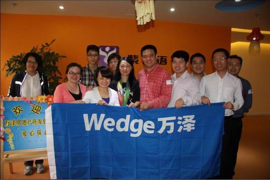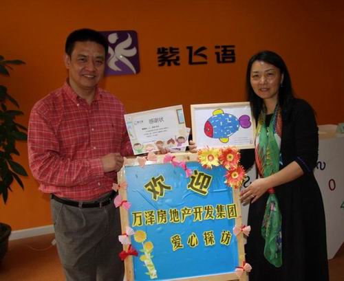 2014年4月16日,在万泽地产集团副总经理冯勇的带领下,公司自发组织的义工队来到紫飞语特殊儿童康复中心,一起来看望那些正在接受自闭症康复的自闭症儿童,亲身体验他们的康复课程,走近这群来自“星星的孩子”。