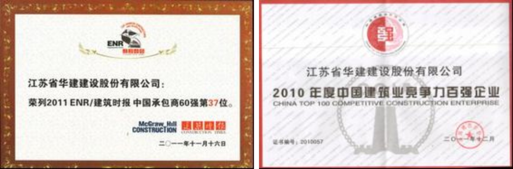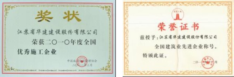 江苏华建在生产经营和企业文化建设方面协调发展,自上世纪90年代起,公司跻身“中国建筑施工企业百强”、“中国承包商60强”、“中国建筑业竞争力百强企业”行列,并多次被评为“全国建筑业先进企业”、“全国优秀施工企业”、“最佳企业”等十几项荣誉称号。