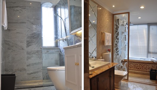卫浴间的空间环境布局基本上以方便、安全、易于清洗及美观得体为主。由于沐浴时有大量的水及雾气,因此装修选材时应以防水、防湿为重点。地版面必须选择防水性好,而且容易清洗的材质。另外,浴室的墙壁和天花板所占的面积比较大,所以应选择既防水又抗腐蚀和防霉的材料来确保室内卫生,瓷砖、桑拿板和具有防水功能的塑料壁纸都要能达到这些要求。